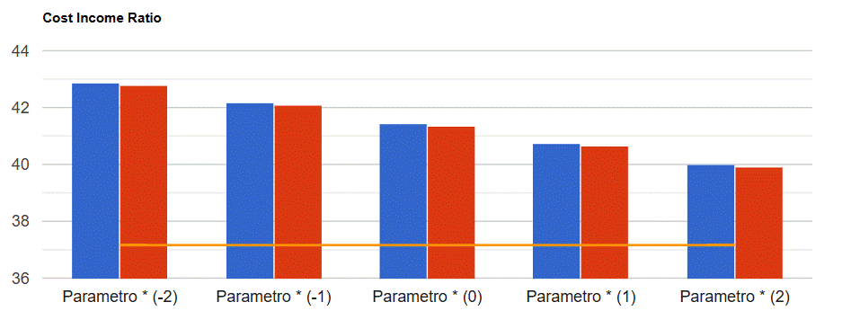 I risultati del modello convergono su un valore per azione di circa 41,4 Euro che tende a crescere (ridursi) di 0,7 Euro per ogni punto in meno (in più) del cost income ratio come mostrato nella figura seguente.