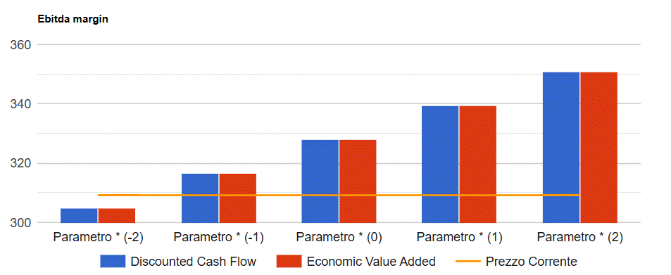 I risultati del modello convergono su un valore per azione di 327,9 Euro che tende a crescere (ridursi) di 11,4 Euro per ogni punto in più (in meno) dell'Ebitda margin come mostrato nella figura seguente.