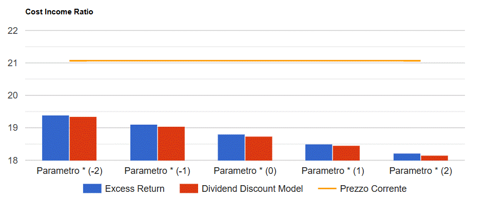 I risultati del modello convergono su un valore per azione di 18,8 Euro che tende a crescere (ridursi) di 0,3 Euro per ogni punto in meno (in più) del cost income ratio come mostrato nella figura seguente.