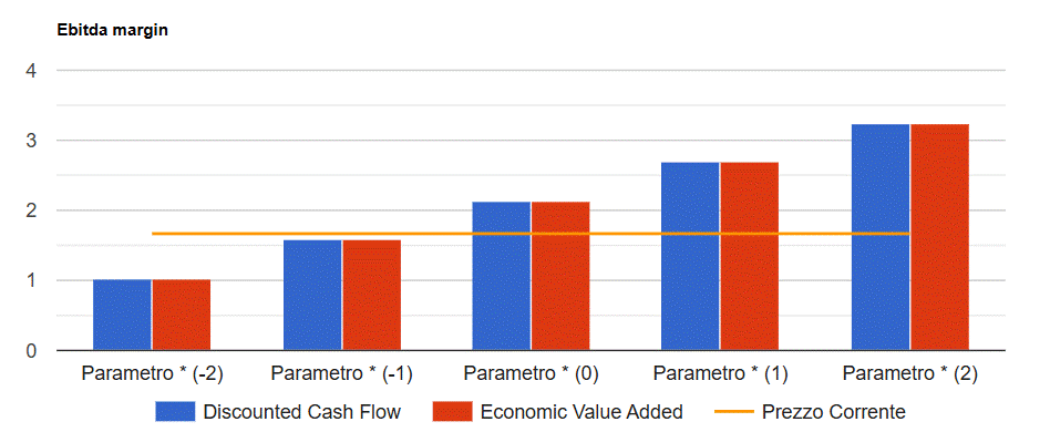 I risultati del modello convergono su un valore per azione di 2,13 Euro che tende a crescere (ridursi) di 0,56 Euro per ogni punto in più (in meno) dell'Ebitda margin come mostrato nella figura seguente.