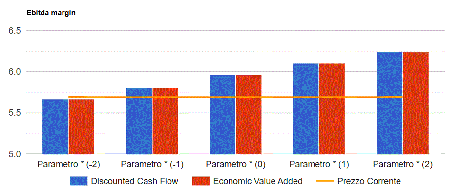 I risultati del modello convergono su un valore per azione di 5,96 Euro che tende a crescere (ridursi) di 0,14 Euro per ogni punto in più (in meno) dell'Ebitda margin come mostrato nella figura seguente.