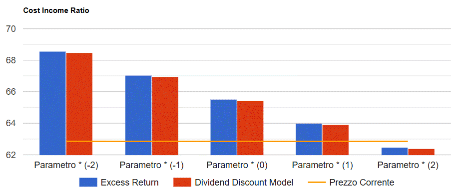 I risultati del modello convergono su un valore per azione di 65,5 Euro che tende a crescere (ridursi) di 1,2 Euro per ogni punto in meno (in più) del cost income ratio come mostrato nella figura seguente.