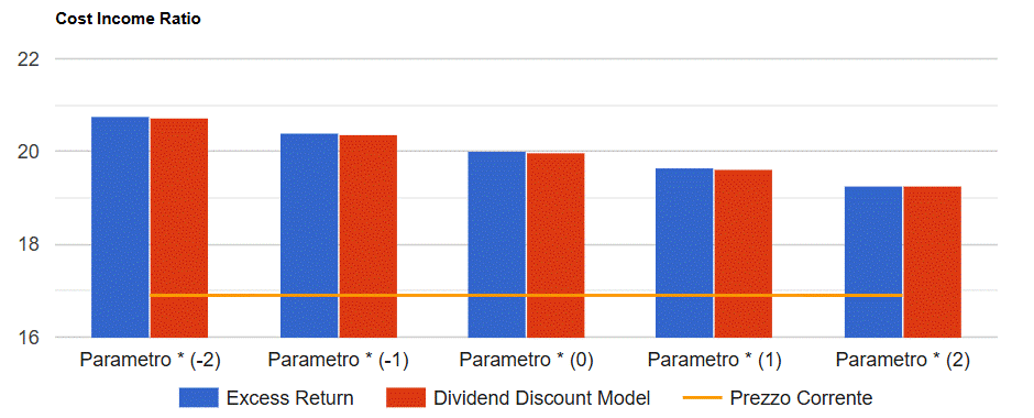 Infine si prevedono: un tax rate in progressiva crescita fino al 25% ed un payout stabile all'85%; i risultati del modello convergono su un valore per azione di 20 Euro che tende a crescere (ridursi) di 0,4 Euro per ogni punto in meno (in più) del cost income ratio come mostrato nella figura seguente.