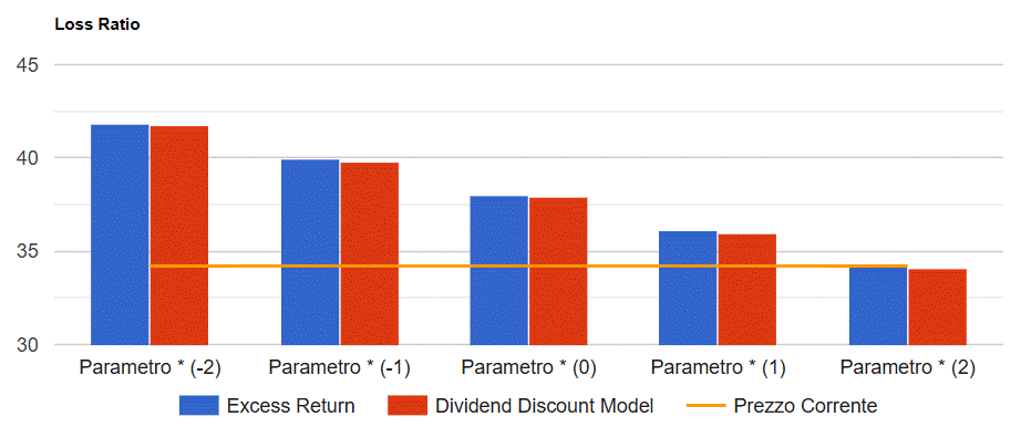 Infine si prevedono un tax rate stabile al 31,5% ed un payout in progressiva crescita fino al 70%; i risultati ottenuti coi due modelli producono un valore per azione di circa 38 Euro che tende a crescere (ridursi) di 1,9 Euro per ogni mezzo punto in meno (in più) dell'incidenza degli oneri tecnici come mostrato nella figura seguente.