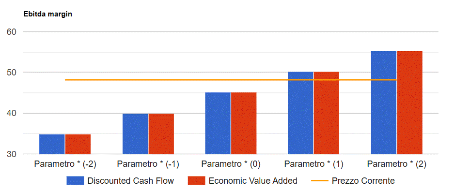 I risultati del modello convergono su un valore per azione di 45,1 Euro che tende a crescere (ridursi) di 5,1 Euro per ogni punto in più (in meno) dell'Ebitda margin come mostrato nella figura seguente.