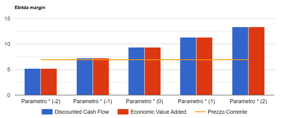 I risultati del modello convergono su un valore per azione di 9,3 Euro che tende a crescere (ridursi) di 2 Euro per ogni mezzo punto in più (in meno) del margine sulle vendite come mostrato nella figura seguente.