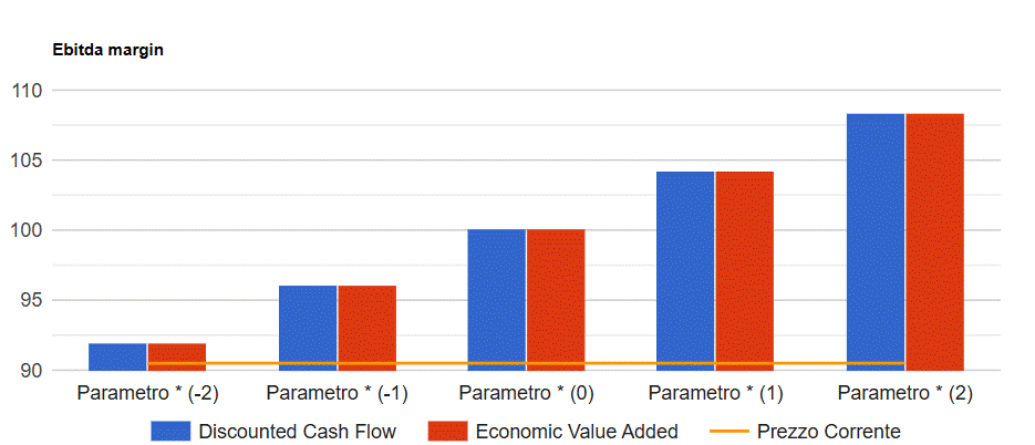 I risultati del modello convergono su un valore per azione di 100,2 Euro che tende a crescere (ridursi) di 2,1 Euro per ogni punto in più (in meno) dell'Ebitda margin come mostrato nella figura seguente.