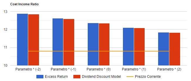 Infine si prevede un tax rate in crescita al 25% ed un payout in progressivo aumento fino al 72% di lungo periodo; i risultati del modello convergono su un valore per azione di 12,35 Euro che tende a crescere (ridursi) di 0,26 Euro per ogni punto in meno (in più) del cost income ratio come mostrato nella figura seguente.